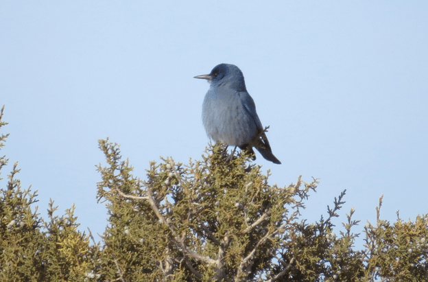 I went home and started pulling references from my shelves. A 1992 reference specific to Colorado refers to Pinyon Jays as “”common to abundant” throughout Western Colorado. On the other hand, the Colorado Breeding Bird Atlas project reported a 15% decline between 1998 and 2016. The on-line reference, all-about-birds, states that “Pinyon Jays are uncommon and their populations have declined by 85% between 1970 and 2014” and that the species is on track to “lose another half of their remaining population by 2036.” Loss of habitat to grazing and development is a major factor in the decline. Leopold said, “subtract the grouse and the whole thing is dead.” It may already be too late to refer to Pinyon Jays as the “numenon” in our local pinyon-juniper canyons.