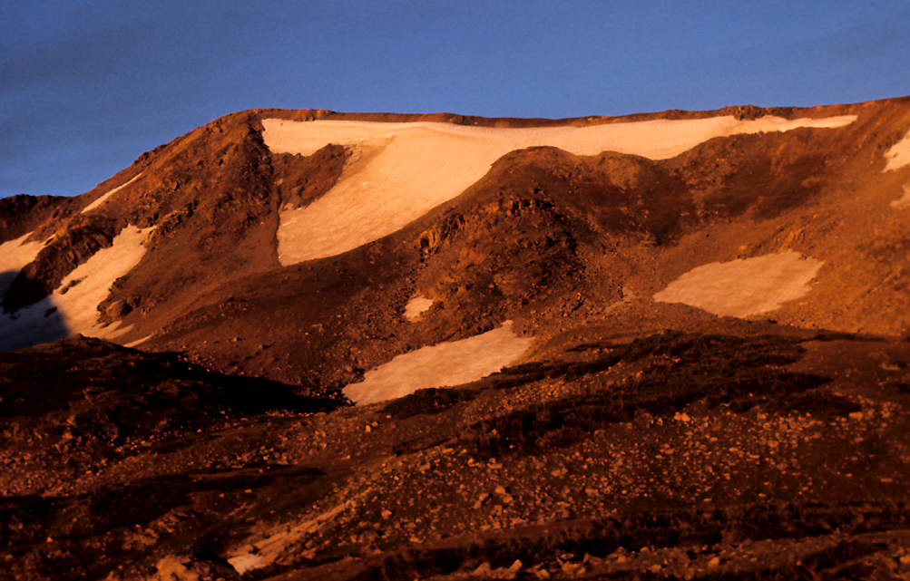 We had already set up a camp near an old hotel at 12,500 feet. (Those miners were tough!). A horrible night ensued. Rain and wind whipped the tent while I was tormented by a severe headache and queasiness. Whenever I would doze, I dreamed of the peak looming malevolently overhead while I slid downward on talus about to tumble over a cliff. I wrote, I felt so bad, I wished I had!