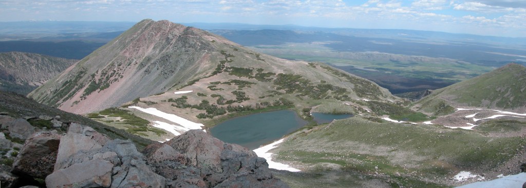 I enjoyed the beautiful morning from the top for more than an hour. The view encompassed the vast meadows of the Ute creek country backed up by La Ventana and the Rio Grande Pyramid. There were the usual familiar peaks for me to pick out: Sneffels, Redcliff, Uncompahgre, and El Diente. I love this country!